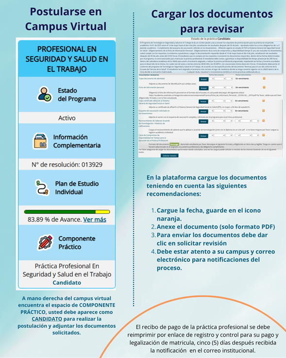 Para realizar la práctica profesional debe cumplir con todos los requisitos establecidos en los lineamientos del programa de Profesional en Seguridad y Salud en el Trabajo y en el Reglamento de Prácticas Formativas de la Escuela de Ciencias de la Salud, de lo contrario no debe postularse.